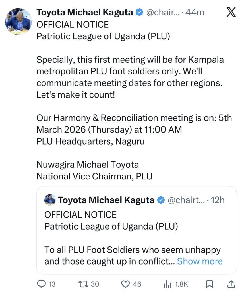 When the National Vice Chairman of the Patriotic League of Uganda, Mr. Michael Nuwagira Kaguta, issued an urgent call for a “ceasefire” and a Harmony and Reconciliation Meeting at the Naguru headquarters on 5th March 2026 at 11:00am, it was more than routine party mobilization. It was an acknowledgment that internal tensions within PLU have reached a level that requires structured intervention.